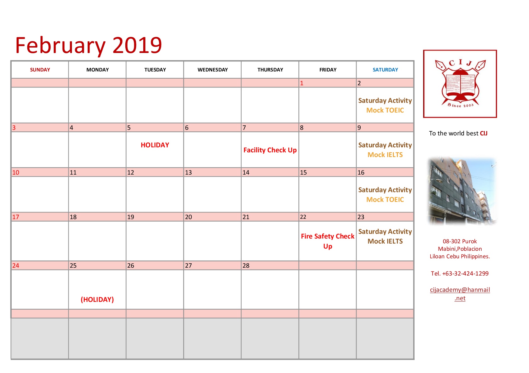 2019-01-31 / 最終更新日 : 2019-01-31 CEBU CIJ お知らせ [SPARTA] 2月の定期日程 CIJ Classic Calender_ (SPARTA) Facebooktwitter