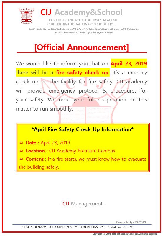 2019-03-27 / Last updated : 2019-03-27 CEBU CIJ Premium Campus [CIJ Academy] Premium 四月火警報器檢查 Follow me! @cijacademy FacebooktwitterHatenaPocketCopy