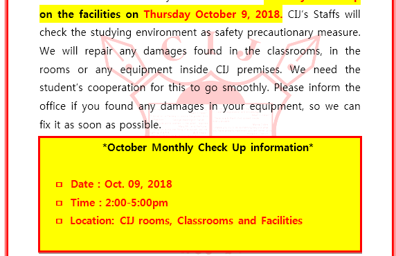 2018年9月27日School(Junior) CampusCEBU CIJ [Announcement] Facility Check-Up for October 2018 in Premium Campus
