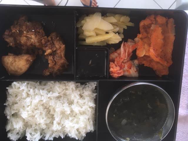Cơm, thịt gà tẩm bột chiên giòn, khoai tây xào với gia vị, nước sốt ( có vị chua và ngọt , mình không biết tên ) , canh rong biển và luôn có kim chi. Canh rong biển thật tuyệt vời . Theo mình biết thì Philippin là đất nước xuaasrt khẩu rong biển lớn và nổi tiếng.