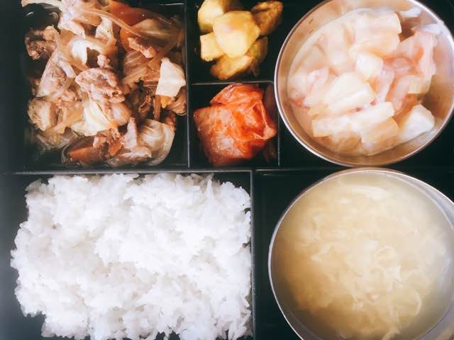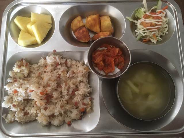Thịt xào với sợi bún khô kết hợp với bắp cải và cà rốt, kim chi, khoai lang chiên, canh trứng , hỗn hợp trái cây và sữa có đương ( mình không biết gọi là món gì ). Thật long mà nói thì mình cảm thấy món thịt xào , canh và kim chi hợp khẩu vị. Còn các món còn lại mình sẽ cố gắng thưởng thức lại trong lần sau . haha.