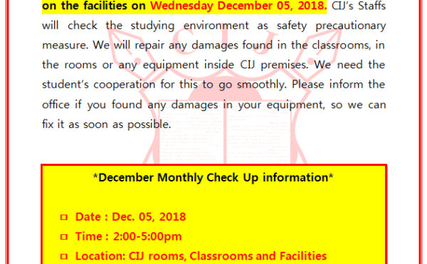 2018-12-04Bảng Thông báoCEBU CIJ [Thông báo] Kiểm tra cơ sở vật chất tháng 12 năm 2018 tại cơ sở Premium